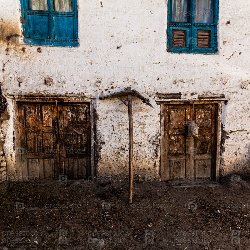 Старомодные традиционные грязные деревянные окна и двери в маленькой горной деревне в Непале