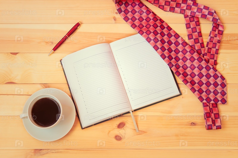 Галстук, дневник, чашка кофе и ручка на деревянном столе