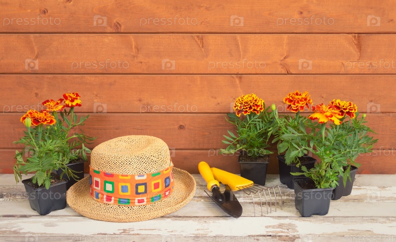 Саженцы календулы, садовые инструменты и соломенная шляпа в качестве границы на деревянном фоне
