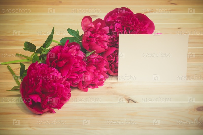 Куча красных пионов и пустая карточка для вашего текста на деревянной поверхности. Выборочный фокус