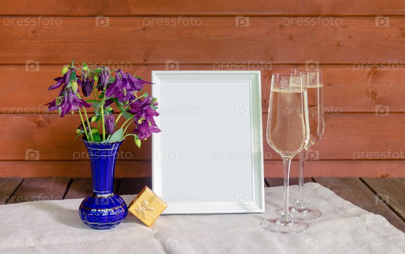 Фиолетовые полевые цветы аквилегии, бокалы шампанского, пустая белая рамка и золотая подарочная коробка на деревянном фоне