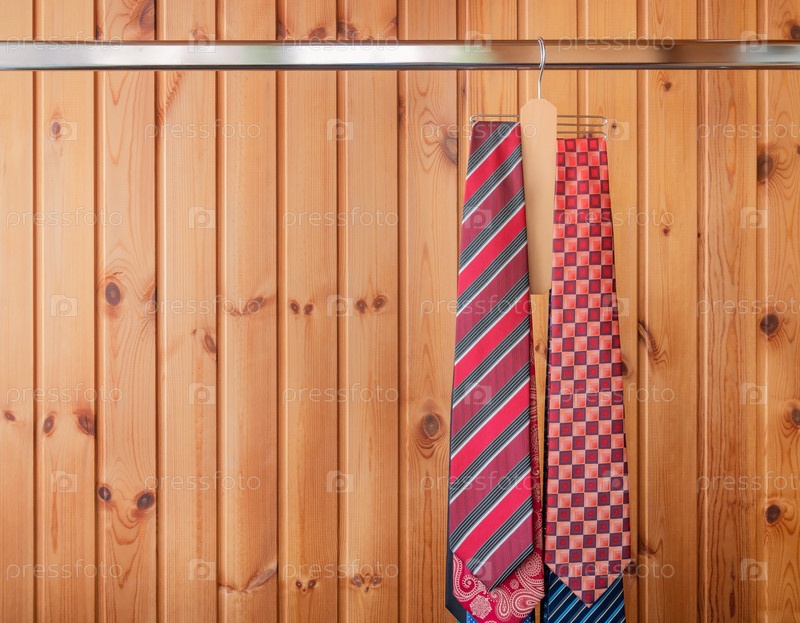 Многие мужские галстуки висят на вешалке. Деревянный фон