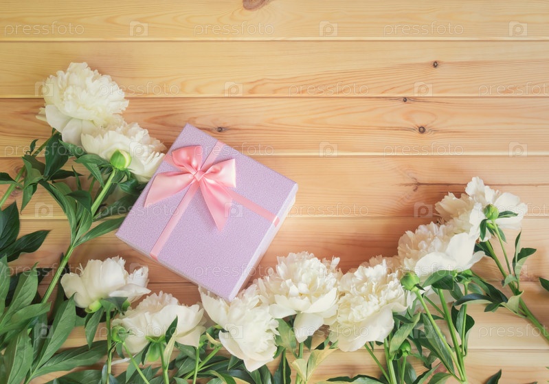 Белые цветы пиона и подарочная коробка на деревянном фоне