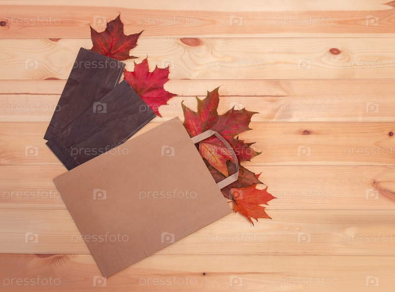 Красочные осенние листья в бумажных пакетах. Концепция продажи и покупок