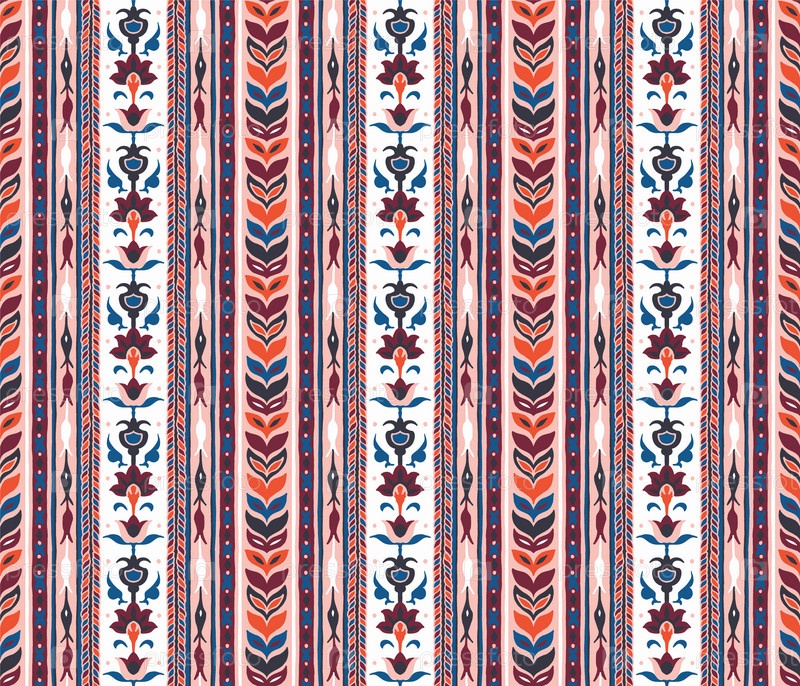 Геометрический дамасский орнамент. Икат границы. Этническая вышивка с листьями и монограммами. Племенная векторная текстура. Бесшовный народный узор в ацтекском стиле. Индийский, скандинавский, цыганский, мексиканский, африканский ковер