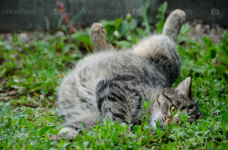Серый кот лежит в зеленой траве пузом вверх