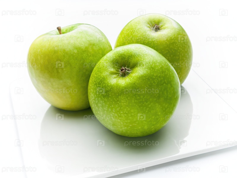 Три целых зеленых больших яблока на плоской белой квадратной тарелке на белом фоне. Крупный план. Нет людей