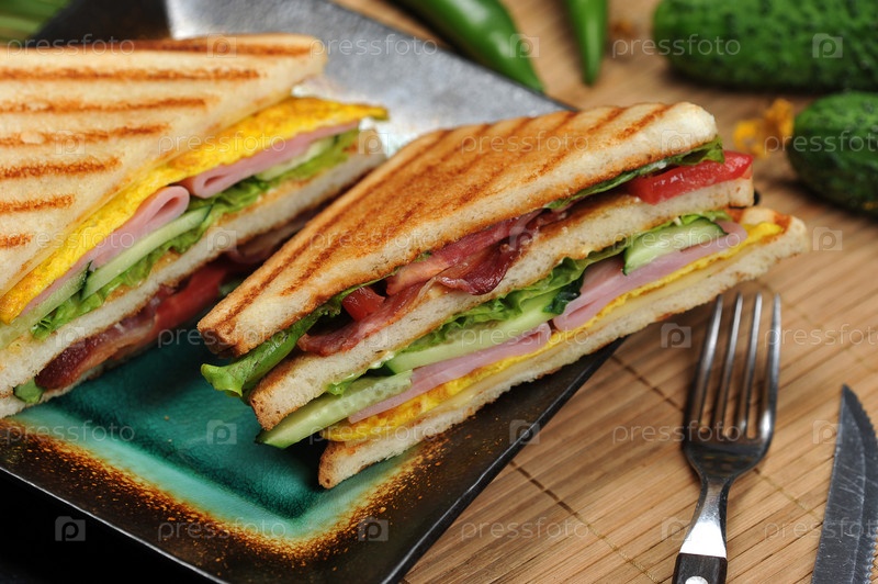 Бутерброды треугольной формы с ветчиной и омлетом на тарелке