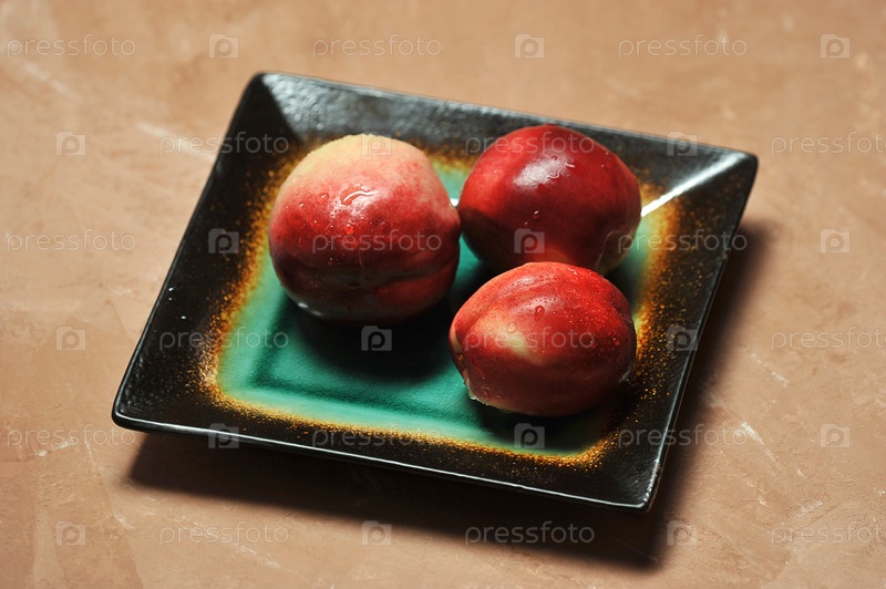 Три нектарина на дизайнерской тарелке