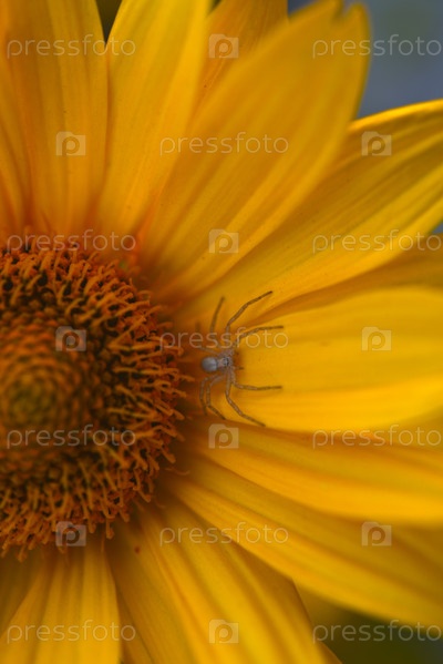 Желтый цветок и паук. Круглый желтый цветок в саду