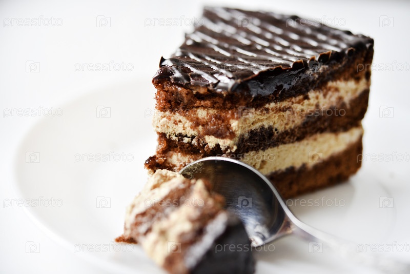 Шоколадный торт на белой тарелке. Торт и ложка. Поедание сладостей