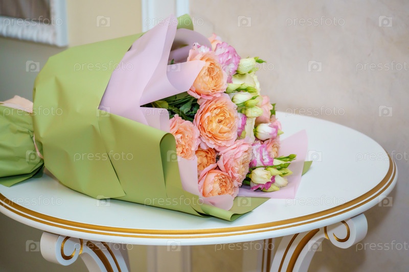 Красивый роскошный букет смешанных цветов лежит на столе. Свадебный букет. Работа флористом в цветочном магазине