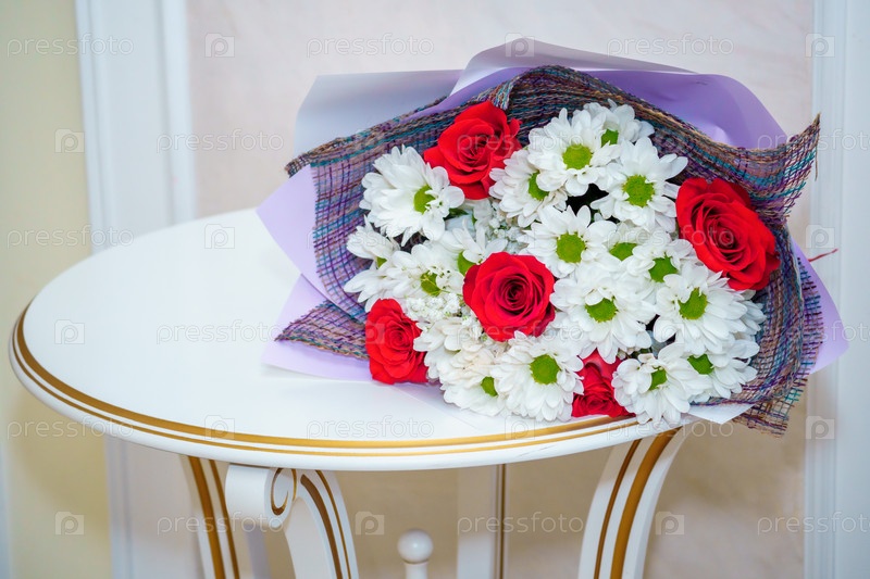 Красивый роскошный букет смешанных цветов лежит на столе. Свадебный букет. Работа флористом в цветочном магазине