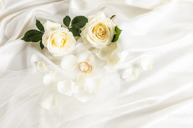 Два золотых обручальных кольца на бежевом атласном фоне с живыми чайными розами и частью фаты невесты. Шикарный макет для дизайна. Свадебный фон