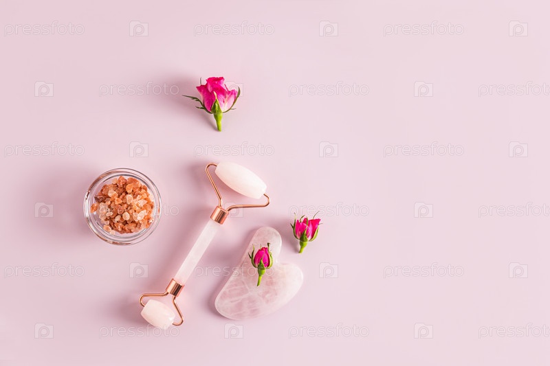 Массажер из розового кварца, скребок гуаша, соль в миске и маленькие бутоны роз. Вид сверху. Розовый фон. Пространство для копирования. натуральный уход
