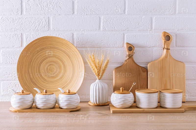 Различные виды кухонной утвари и посуды на мраморной столешнице на фоне белой кирпичной стены. передний план. экологически чистая кухня