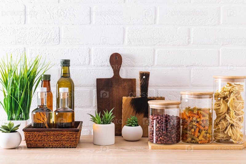 Различные бутылочки из-под масла для приготовления пищи и стеклянные банки для сыпучих продуктов, разделочные доски и зеленые растения в интерьере кухни. передний план