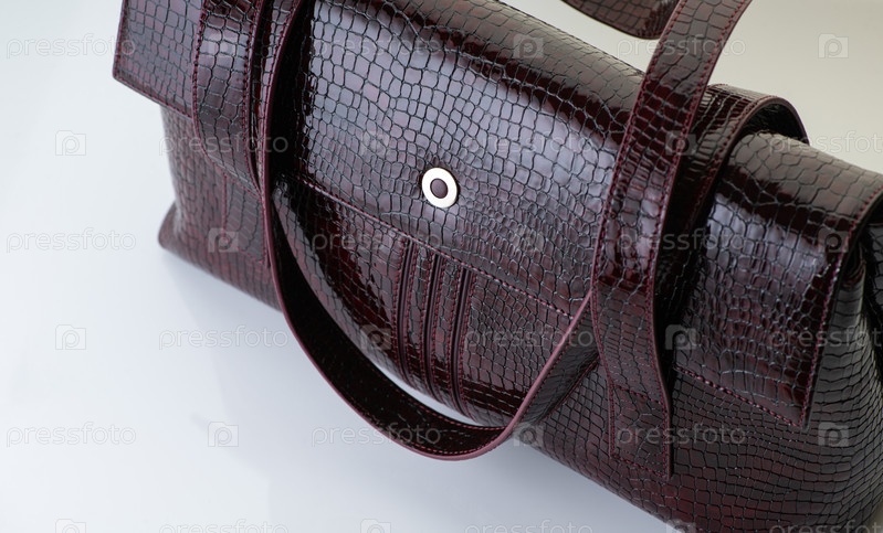 Крупный план модной коричневой женской сумки из крокодиловой кожи на белом фоне
