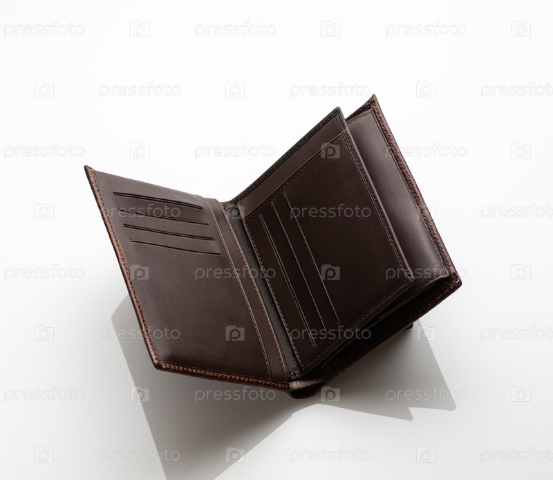 Крупный план модного кожаного мужского кошелька на белом фоне с отражением