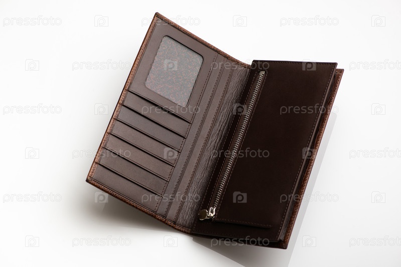 Крупный план модного кожаного мужского кошелька на белом фоне с отражением