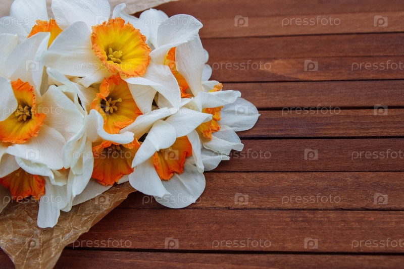 Букет бело-оранжевых нарциссов в винтажной оберточной бумаге на коричневом деревянном фоне с пустым пространством для текста, копией пространства, элементом дизайна, поздравительной открыткой