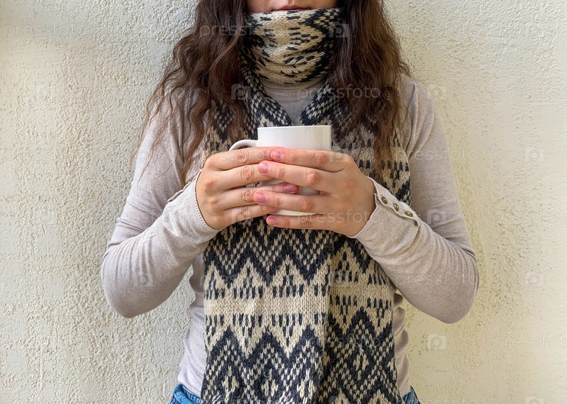 Женщина с вьющимися волосами в шарфе с чашкой кофе