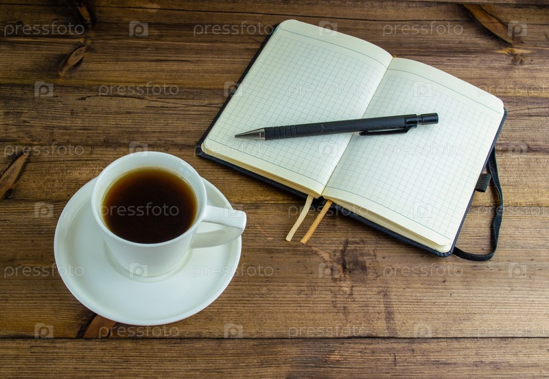 Кофе в чашке, блокноте и ручке