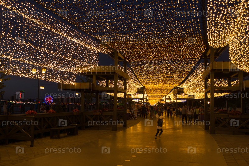 Россия, Казань - 8 августа 2017 г.: Люди ходят по пешеходной зоне Кремлевской набережной в вечернем освещении