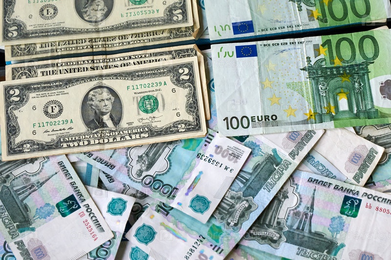 Фон бумажных купюр долларов, евро и рублей. Курс обмена валют