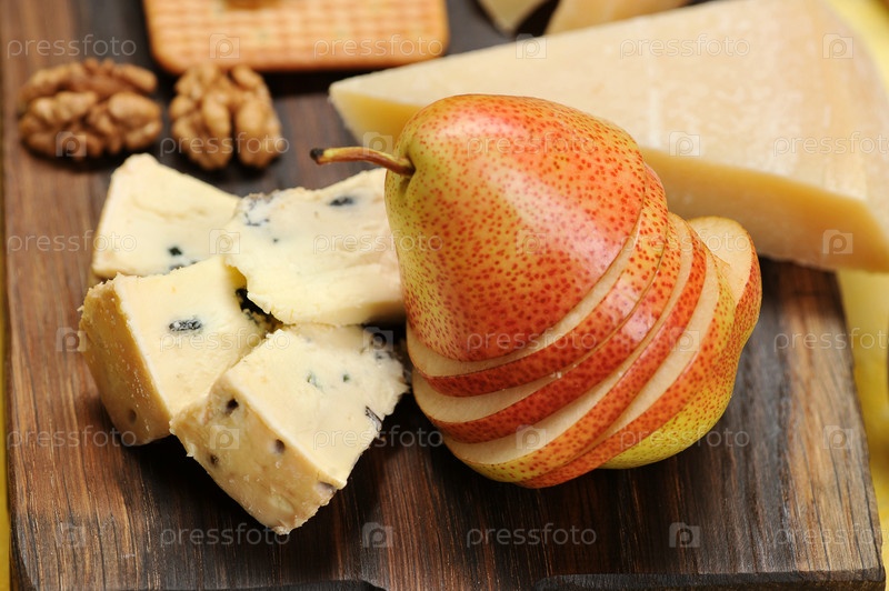 Груша нарезанная ломтиками, сыр и грецкие орехи на деревянной доске