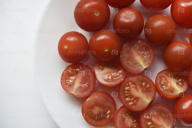 Свежие красные плоды маленьких помидоров на стеклянной тарелке. Сочные нарезанные помидоры черри