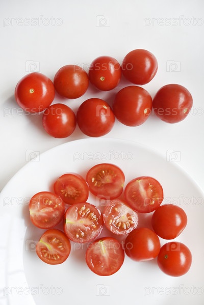 Свежие красные плоды маленьких помидоров на стеклянной тарелке. Сочные нарезанные помидоры черри