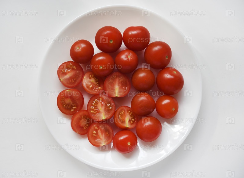 Свежие красные плоды маленьких помидоров на стеклянной тарелке. Сочные нарезанные помидоры черри
