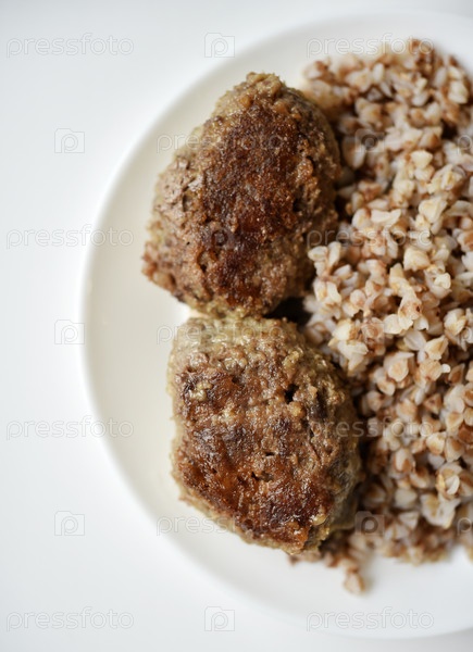Гречневая каша с мясной котлетой. Вкусный мясной завтрак на тарелке