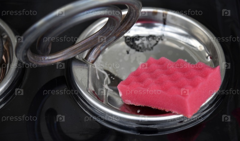 Чистка электроплиты розовой щеткой. Чистка кухонной плиты