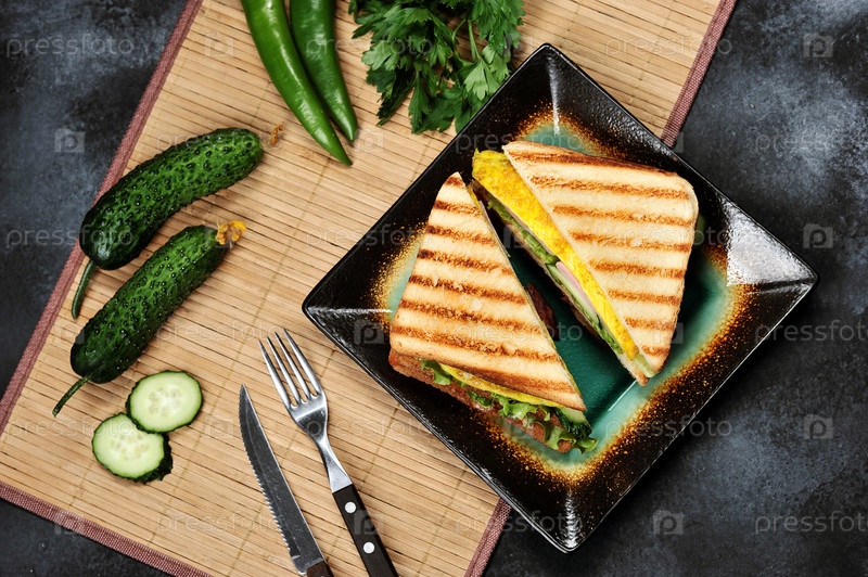 Вид сверху на бутербродный тост с салатом, ветчиной, яйцом