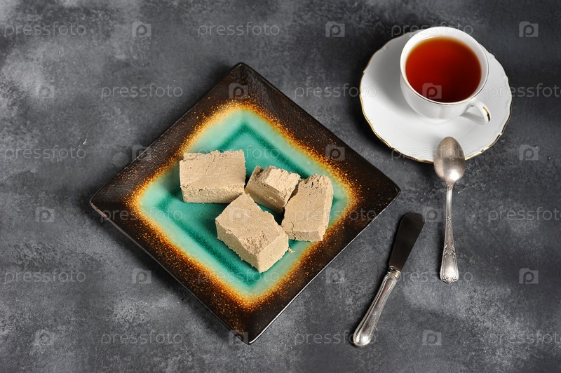 Чай в кружке с золотым краем и блюдце и нарезанная на кусочки халва