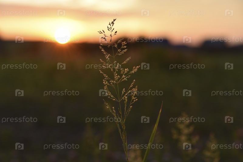 Полевая трава в лучах заходящего солнца. Солнечный диск и трава. Красиво освещенная трава