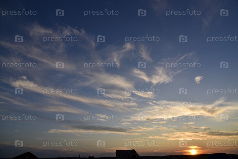 Красивый летний закатный вечер. Сине-желтые облака заходящего солнца. Закатный горизонт