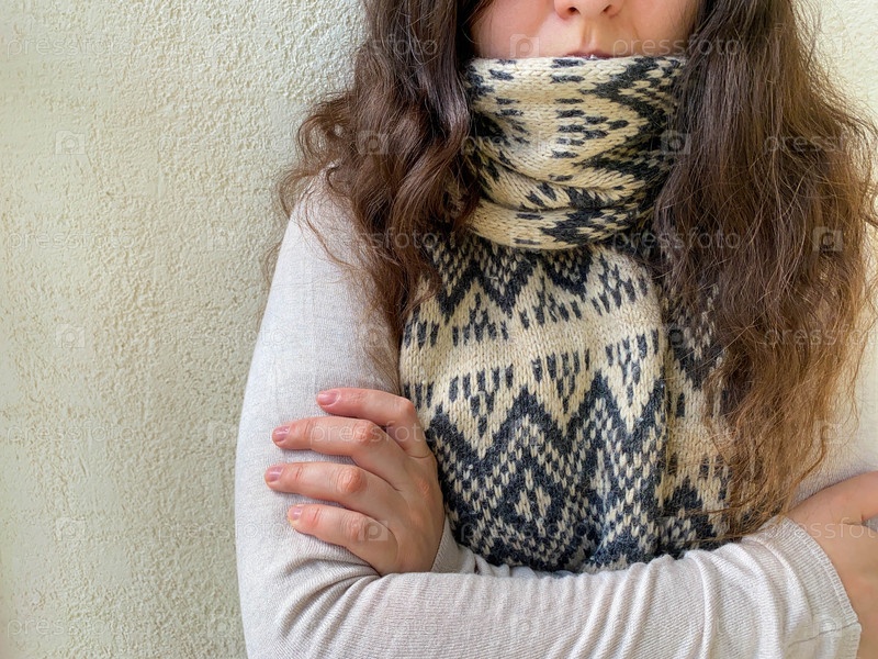 Женщина в шарфе и водолазке, холодная погода, без отопления