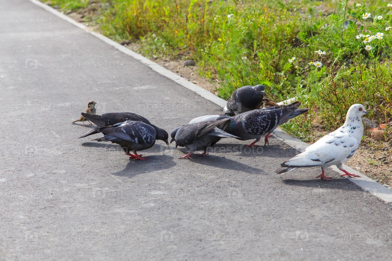 Птицы клюют зерно на улице, крупный план, выборочный фокус. Крупный план серых голубей и воробьев, клюющих зерно с земли. Улица, дикие птицы едят еду в парке - выборочный фокус