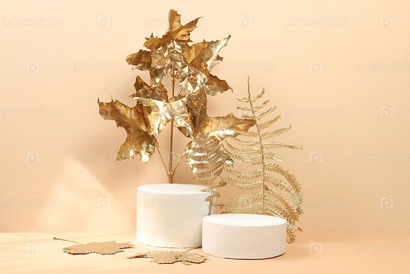Золотые кленовые листья на премиальном пастельном фоне с пустым подиумом для демонстрации продукта, креативная осенняя композиция с минимальной осенней концепцией, экранный баннер с местом для текста. С Днем Благодарения и открытки, выборочный фокус