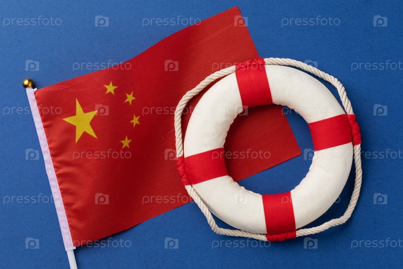 Китайский флаг и спасательный круг на синем фоне, концепция на тему помощи из Китая