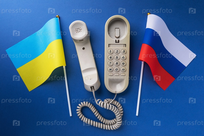 Старый телефон и два флага на синем фоне, концепция на тему телефонных разговоров между Украиной и Россией