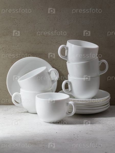 Набор из 6 пар белой керамической посуды, чашек и блюдец для чая или кофе на столе