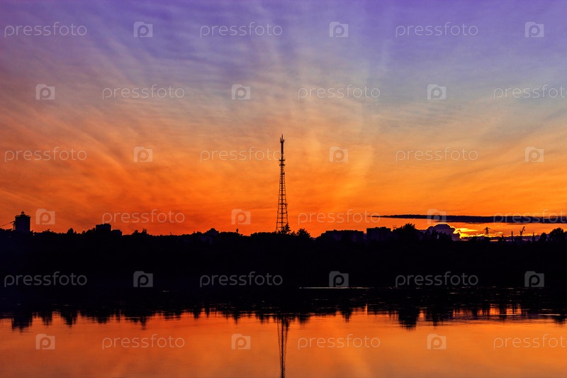 Река и башня на закате летним вечером