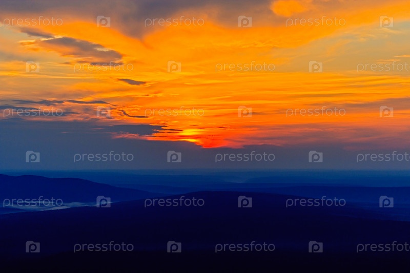 Закат в облаках над дальними холмами