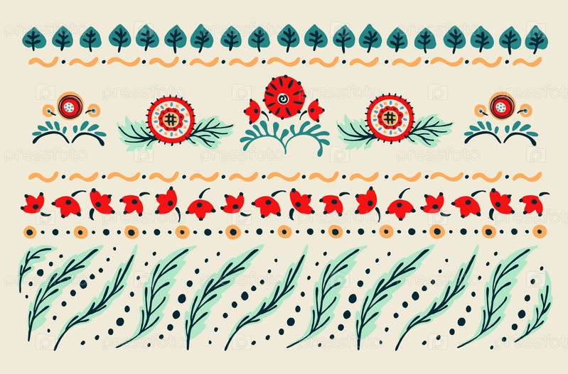 Набор этнических элементов. Бордюр представляет собой полосу с цветами, листьями, ветками, вензелями. Народная вышивка. Славянский, украинский, русский мотив. Хохлома, матрешка, дымковская игрушка. Мексиканский, индийский, цыганский ковер. Вязаное кружево