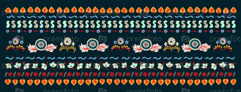 Набор этнических элементов. Бордюр представляет собой полосу с цветами, листьями, ветками, вензелями. Народная вышивка. Славянский, украинский, русский мотив. Хохлома, матрешка, дымковская игрушка. Мексиканский, индийский, цыганский ковер. Вязаное кружево