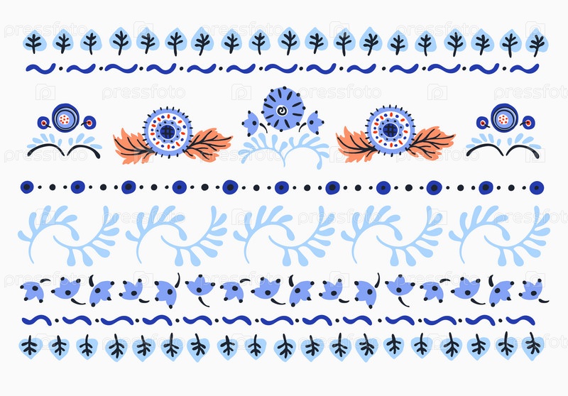 Набор этнических элементов. Бордюр представляет собой полосу с цветами, листьями, ветками, вензелями. Народная вышивка. Славянский, украинский, русский мотив. Хохлома, матрешка, дымковская игрушка. Мексиканский, индийский, цыганский ковер. Вязаное кружево